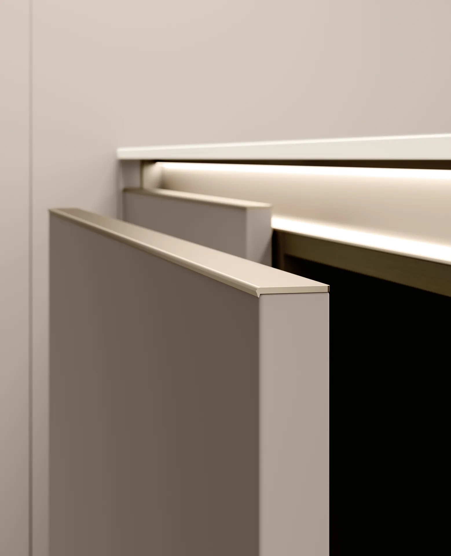In linea con il principio di massima personalizzazione, il profilo maniglia è disponibile in quattro finiture coordinabili alla gola per realizzare composizioni armoniche ed omogenee.