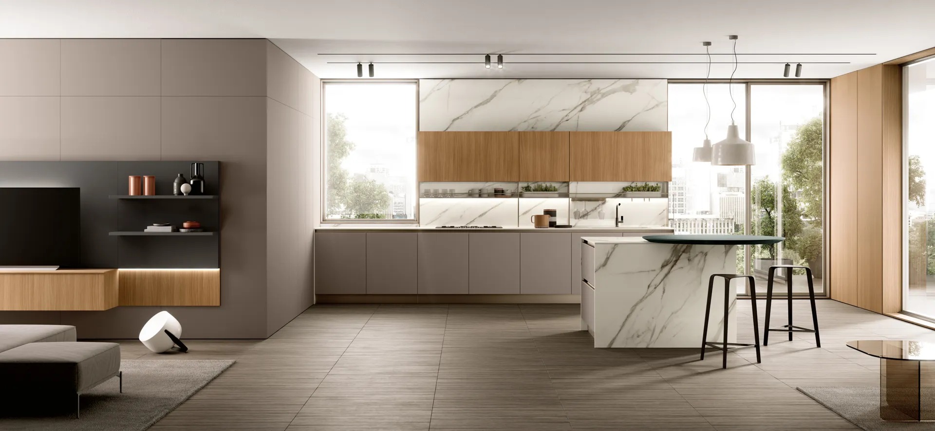 Un dialogo vivace tra cucina, zona giorno e zona notte è garantito da finiture comuni alle collezioni Night&Day, Golf e Volo per infondere un’atmosfera accogliente e un senso di benessere.